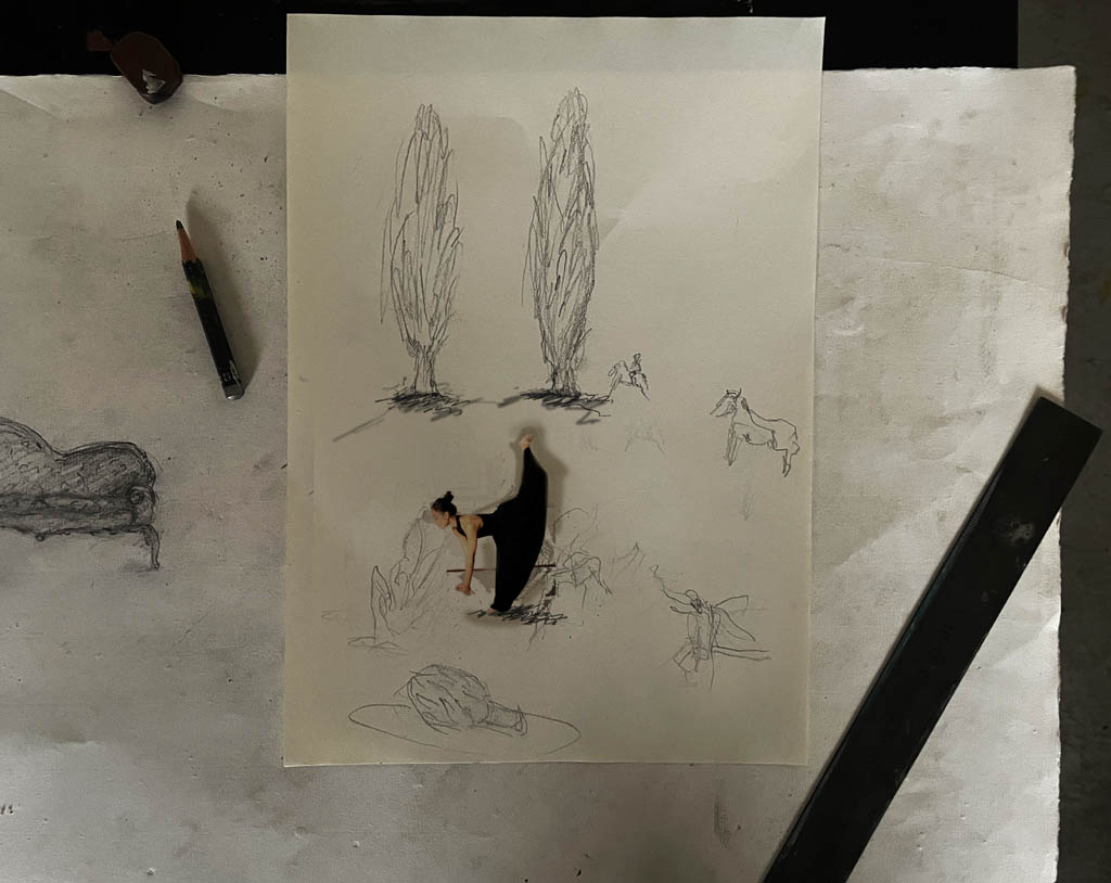 Tristan&Isolde 2023 Digitaldruck, Bleistift, Acrylfarben auf Frontlit PVC. 120x240 cm (HxBr)